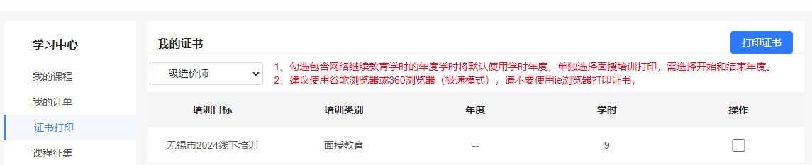 关于2024年度无锡市注册造价工程师继续教育现场培训证书打印的通知如下: